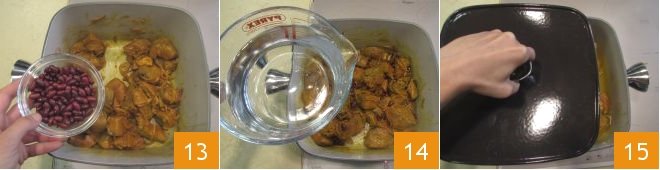Add the dried beans 13 and 4 cups of water 14, then cover with a lid 15 and let cook for about 20 minutes.