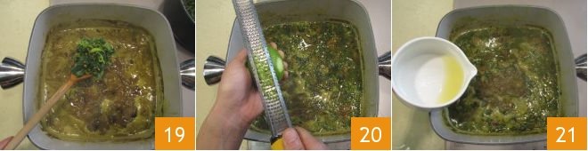 After this time, add the cooked herbs to the pot with the meat 19, then also add the lime zest 20 and juice 21.