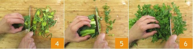 Wash and finely slice the green part of the leek 4, then do the same with the green part of the scallions 5. Finally, wash and chop both the parsley 6
