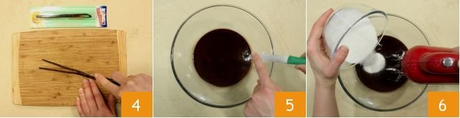 Then slit a vanilla bean 4 and scrape out the seeds; add them to the melted chocolate 5, then also pour in the sugar 6,
