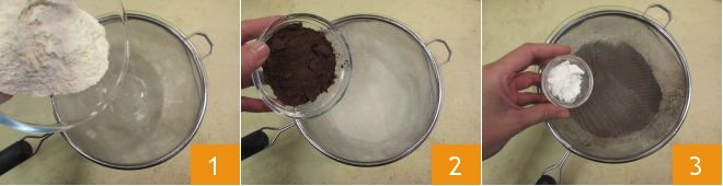 To prepare the gingerbread bundt cake, first melt the dark chocolate in the microwave or a double boiler, then let it cool slightly. In a large bowl, sift the flour 1, cocoa 2, and baking powder.