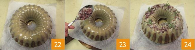 Cover the surface 22, immediately garnish with the sugared cranberries 23. The gingerbread bundt cake is ready to be enjoyed 24.
