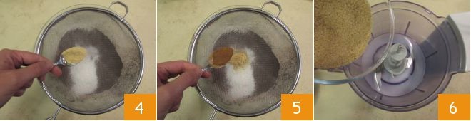 Season the dry ingredients with ground ginger, ground cinnamon 5, and a pinch of grated nutmeg. In the mixer bowl, add the brown sugar 6.