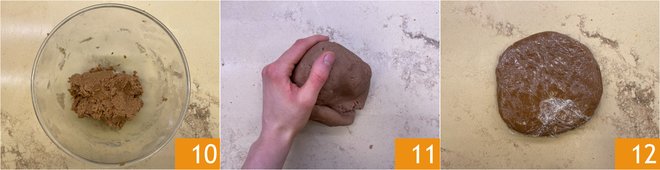 Knead with your hands first in the bowl 10 and then on the work surface 11. Form a dough ball, wrap it in plastic wrap, and let it rest in the refrigerator for 3 hours 12.