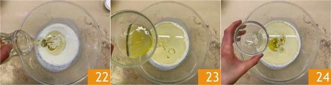 After this time, add the vegetable oil 22, egg white 23, and vinegar 24.