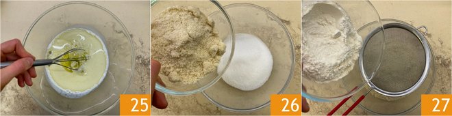 Mix with a whisk to combine the liquids 22 and set aside for a moment. In another bowl, combine the sugar and almond flour 26, then sift in the all-purpose flour 27.