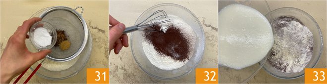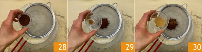 Sift the cocoa 28, cinnamon 29, and ginger 30 into the bowl as well.