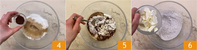 Also flavor with ginger and cocoa 4, then mix to combine the dry ingredients 5. Now add the cold cubed butter 6.