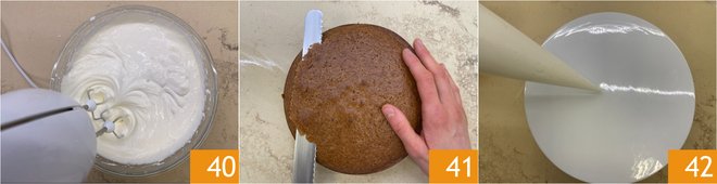 Mix well with electric beaters to obtain a firm and homogeneous cream 40, then transfer it to a piping bag without a nozzle. Once the bases have completely cooled, remove the top dome with a serrated knife to level the surface 41. Take the serving plate and squeeze a dollop of cream at the base to keep the cake steady 42.