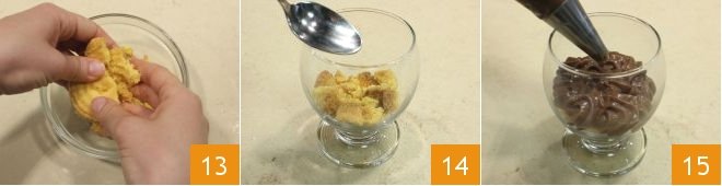 When the cream is puffy and thick, transfer the double boiler to a bowl full of ice to cool the zabaglione quickly. Now assemble the glasses with a capacity of about 7 ounces: roughly crumble the cornmeal cookies 13, then place a layer of crumbled cookies at the bottom of the glass 14, take the chocolate custard, transfer it to a piping bag with a star tip, and squeeze some cream into the glass 15,