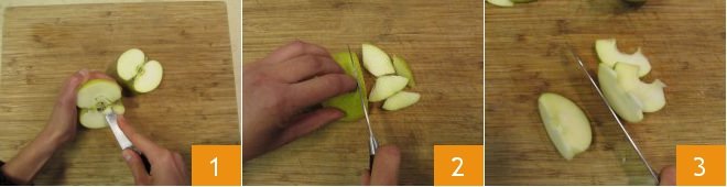 To make the gluten-free apple and pecan loaf cake, first wash the apples, then cut them in half, remove the core with a small knife 1 and cut two and a half apples into 1/8 inch slices 2. Cut the remaining half into 3/16 inch slices 3, these will be used for decoration.