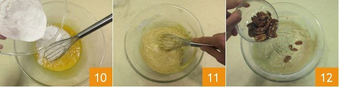 Also add the rice flour 10 and baking powder. All products should have the classic crossed-out ear, indicating certified gluten-free products. Mix again until the batter is homogeneous 11. At this point, add the pecans 12.