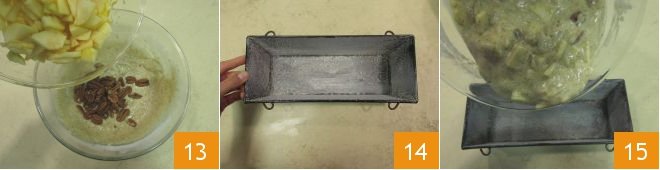 Then also add the 1/8 inch apple slices 13. Butter and flour a loaf cake pan that measures 10.5x4.5 inches 14. Pour the batter into the pan 15.