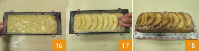 Smooth the surface with a spatula 16. Arrange the thicker apple slices on top, next to each other 16 and sprinkle with brown sugar 17. Bake in a preheated static oven at 350°F for 55 minutes. Once cooked, take the gluten-free apple and pecan loaf cake out of the oven, let it cool slightly, then remove it from the pan and dust with powdered sugar and ground cinnamon 18.