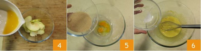 Place the apple slices in two different bowls and drizzle them with orange juice 4. Now prepare the batter: in a bowl, break the eggs, add the brown sugar 5 and beat with a hand whisk until you get a light mixture. Also add the salt 6.