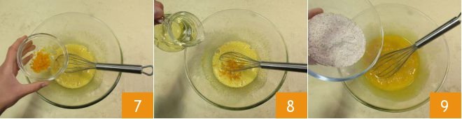 Flavor the batter with grated orange zest 7 and vegetable oil 8. Incorporate these ingredients with the whisk, then also add the buckwheat flour 9.