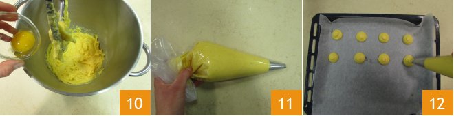 When this is also well absorbed, add the egg yolk 10. Continue working until you get an elastic and soft dough, then transfer it to a piping bag with a smooth 10 mm tip 11. Form the cream puffs on a baking sheet lined with parchment paper; you need to make puffs of 1.2-1.6 inches, spacing them apart.