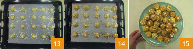 Sprinkle the surface with sugar granules 13 and bake in a convection oven at 390°F for about 25-30 minutes. Then remove the gluten-free cream puffs from the oven 14 and let them cool before filling them 15.