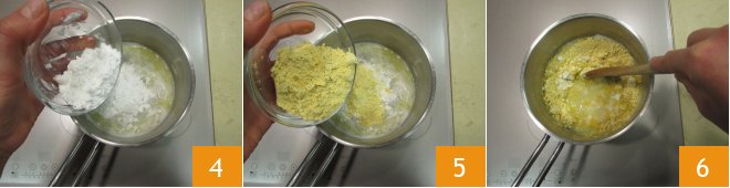 Add the corn starch 4 and lupin flour 5 as well. Mix well with a wooden spoon 6 until all the ingredients are combined.