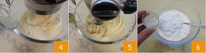 Once the eggs have become light and fluffy, with the mixer still running, slowly add both the milk 4 and the oil 5, very slowly, then turn off the machine. At this point, in a bowl, combine 200 grams of rice flour (the remaining 30 grams will be used later), potato starch, corn starch, baking powder, and xanthan gum 6.