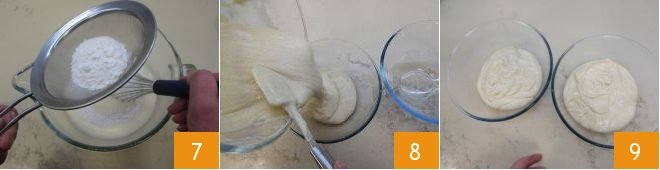 Then gradually add the flour mix, sifting it, to the whipped egg mixture and mix gradually with a whisk 7. Divide the batter into two equal parts, resulting in about 19.4 ounces per bowl (8-9).