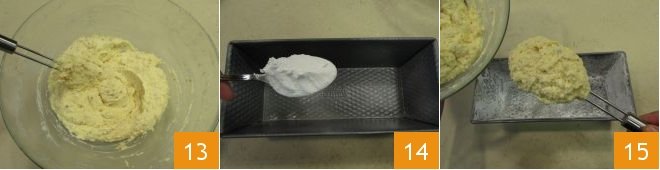 and incorporate them with the rest by mixing with a spatula 13. At this point, take a 26x11 cm loaf pan, butter it, and dust it with potato starch 14. Pour the mixture inside 15.