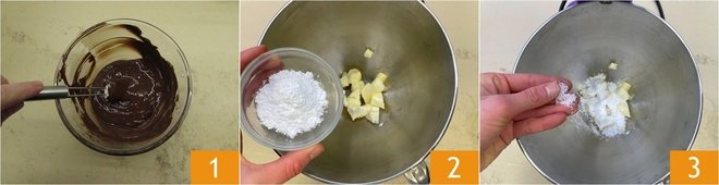 To prepare your Gluten-free Raspberry Sacher, start by separating the eggs. Finely chop the chocolate and melt it in the microwave or in a bain-marie 1. In the bowl of a stand mixer add the softened butter cut into cubes, the powdered sugar 2 and a pinch of salt 3.
