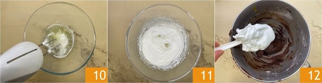 Beat the sugar with the egg whites with an electric mixer 10 and whip them to stiff peaks 11. Fold the whipped egg whites into the chocolate mixture, little by little, using slow bottom-to-top movements 12.