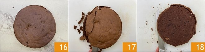 Let it cool slightly 16, then unmold the cake and transfer it to a wire rack to cool completely. When it is cold, cut away the top crust with a long serrated knife 17, then cut the cake in half 18.