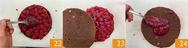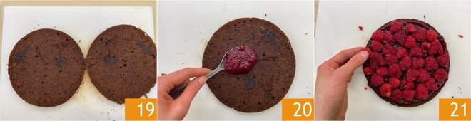 This way you will obtain 2 layers. Spread about one-third of the raspberry jam on the base 20, then arrange the fresh raspberries halved (reserving some for decoration) 21.