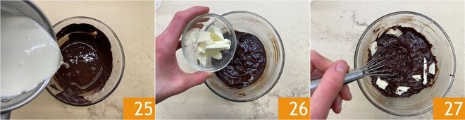 Meanwhile prepare the ganache: chop the chocolate, transfer it to a bowl and melt it as before, in the microwave or in a bain-marie. Heat the cream without bringing it to a boil, then pour it over the dark chocolate and stir until you obtain a smooth cream. Finally add the butter 26 and blend thoroughly 27.
