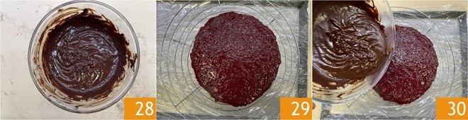 You should obtain a smooth, homogeneous cream 28. Take the cake from the freezer and place it on a wire rack with a tray underneath to catch excess glaze 29. Pour the ganache in the center 30 and let it gently run down the sides.