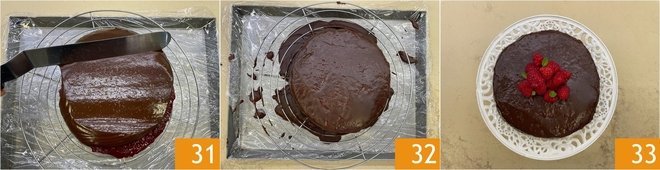 Use a spatula to level the surface 31. Refrigerate for about 20 minutes, until the coating is well set 32. Finish by decorating with fresh raspberries and a few mint leaves on top. Your gluten-free Raspberry Sacher is ready to be served 33!