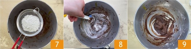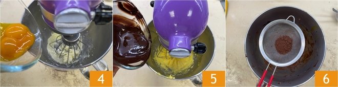 Turn on the whisk and beat until you obtain a creamy mixture, then incorporate the yolks one at a time 4, taking care to add the next only when the previous one has been well absorbed. Then add the warm melted chocolate 5 and stir until you obtain a creamy, homogeneous mixture. Sift the cocoa into it 6.