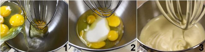 To prepare the gluten-free Sponge Cake start by placing the eggs (at room temperature!) in a stand mixer 1, then add the sugar 2 and whisk the ingredients for at least 10/15 minutes until you obtain a frothy, fluffy, and light yellow colored mixture 3.