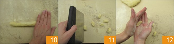 Shape the dough into logs 10, then cut into pieces of about 0.6 inches 11, and form them into the classic shape of ravioles 12.