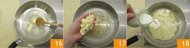 Now, make the sauce: melt the butter in a pan 16 until it becomes brown and takes on a nice amber color. Add the Raschera 17, stir for about thirty seconds, and then add the cream 18.