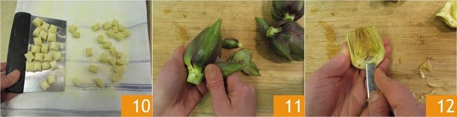 placing them on a tray covered with a semolina-floured towel, to prevent them from sticking to each other 10. Now, focus on preparing the artichoke chips: in a pan with high sides, heat the frying oil over medium heat. Clean the artichokes wearing gloves or rubbing your hands with some lemon juice to avoid them darkening. Remove the outer fibrous leaves 11, cut them in half, and also remove the internal fuzz 12.
