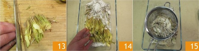 Then cut them lengthwise into very thin slices 13. Pass them in rice flour 14, ensuring they are well coated, then place them in a sieve to shake off excess flour 15.