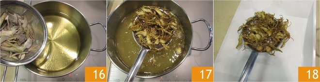 When the oil reaches 356°F, start frying the artichokes a few at a time 16 for 3-5 minutes or until golden 17. Once ready, drain them on kitchen paper 18, being careful not to overlap them too much, and salt them immediately. Set them aside, and if you prefer, you can keep them warm in the oven at 266°F, in static mode.