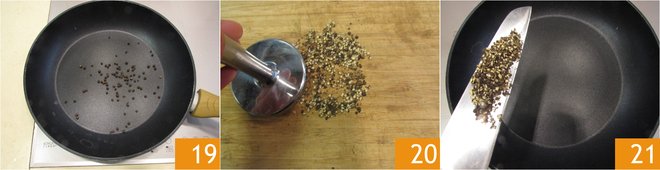 For the cooking of the gnocchi and the sauce, start by bringing a pot of water to a boil. Once boiling, salt it slightly less than you normally would, as Pecorino is already very salty. Meanwhile, in a very large pan, toast the peppercorns for a few minutes over medium heat 19: when their aroma is released, then remove them from the heat and crush them coarsely in a mortar or with a meat mallet 20. Set aside a few whole peppercorns for decoration. Return the remaining crushed peppercorns to the pan and heat over medium 21.