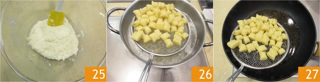 Mix to obtain a fairly thick paste, with a consistency similar to pâté 25. When the gnocchi rise to the surface, drain them 26 directly into the pan with the pepper 27, mix gently, then turn off the heat.