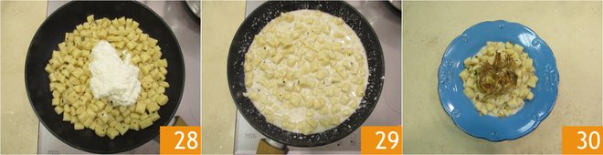 Add the Pecorino paste in several spoonfuls 28 and start mixing very gently or, even better, toss them to melt and combine the cheese. You might need a bit more cooking water: add as much as needed to create a creamy sauce 29. Serve the gnocchi cacio e pepe immediately, topping them with abundant artichoke chips 30.