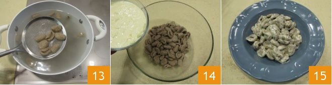Now take a pot, fill it with water, salt it, and bring to a boil. When the water boils, add the gnocchi. When the gnocchi rise to the surface, after about 3 or 4 minutes, they are ready; use a slotted spoon to drain them 13 and place them in a bowl. Add the melted Fontina and milk to the gnocchi 14. Mix the gnocchi well with the sauce you prepared so that the gnocchi absorb the sauce and blend with it. Plate your gnocchi alla bava 15 while still hot and... enjoy your meal!