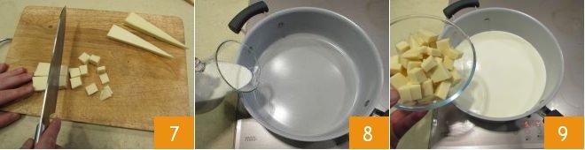 Now proceed with preparing the Fontina. Place the Fontina on a cutting board and remove the outer crust. Then cut the Fontina into slices by cutting horizontally through your piece of cheese, and subsequently cut it into cubes about 1/2 inch (1 cm) 7. Take a saucepan and pour in the milk 8. Heat and add the Fontina 9. Melt the Fontina on low heat, stirring well with a wooden spoon or spatula. The Fontina must melt completely and blend well with the milk without producing lumps. Season with pepper. When the Fontina is fully melted and lump-free, turn off the heat.