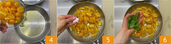 Add the cherry tomatoes 4, season with salt 5, and add the basil 6. Cook over medium-low heat for about 30 minutes.
