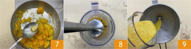 Remove the garlic 7 and transfer everything into a jug, then blend with an immersion blender until you obtain a smooth sauce 8. For an even smoother sauce, strain it through a sieve into a bowl 9 and set aside.