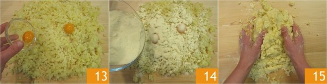 Now add the egg yolks 13 and cover everything with the semolina flour 14, then knead with your hands until you get a homogeneous mixture 15.