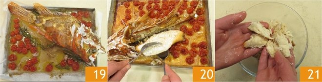 After the cooking time of the scorpionfish 19, remove from the oven and clean the fish, extracting only the flesh 20. Transfer it to a bowl and break it up with your hands, checking that there are no bones 21.