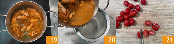 Cook for 30 minutes from boiling point 19. After this time, strain the bisque through a fine sieve 20 and set aside. Move on to the sauce: wash and halve the cherry tomatoes 21.